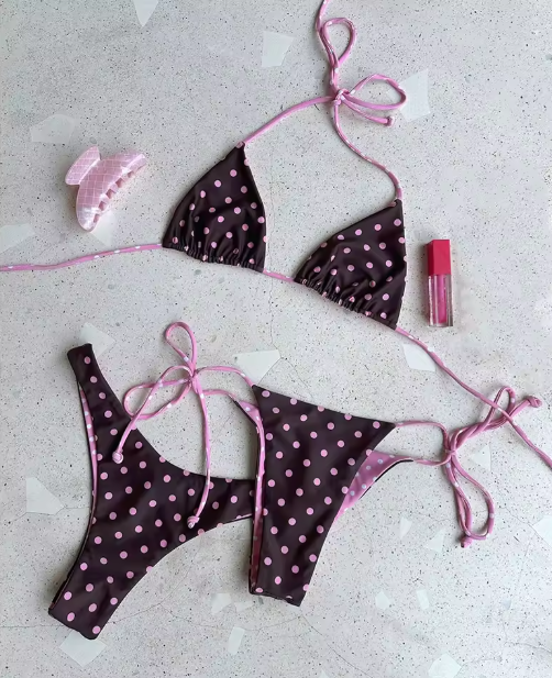 Violet’s Polka Dot 3-Piece Set is a flirty, feminine swim essential designed to turn heads from poolside lounging to sunset strolls. This chic brown and pink polka dot bikini set features a classic triangle bikini top and two different matching bottoms, giving you multiple looks in one effortless set. Made for sun-soaked days and golden hour moments, this set lets you switch up your vibe while keeping the same playful, standout print.